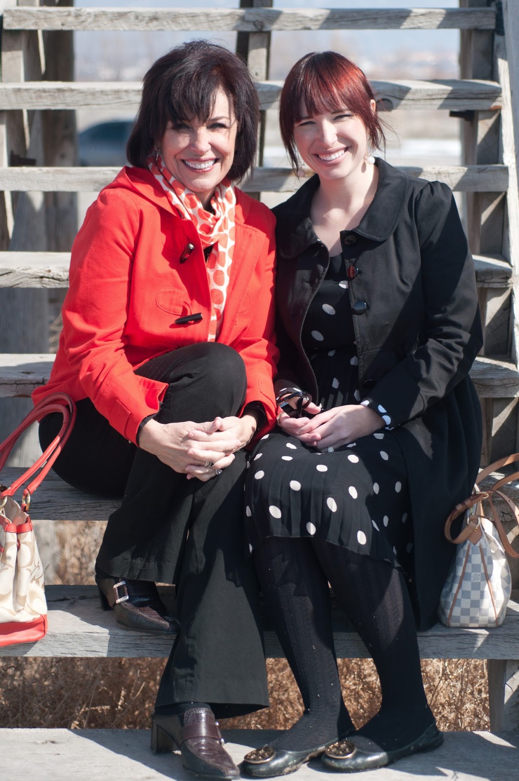 I LOVE the black and white trend going on right now! Its amazing! Not only is it timeless, they are staple wardrobe items! I feel like you can go to your closet and find things to make them work for this trend! This is exactly what my mom and I did! When she came into town, we decided to take a little photo shoot! She searched through her suit case, and I looked through my closet and we picked out some black and white polka dot attire! My mom and I had so much fun taking pictures, we are going to have to do a photo shoot every time we are together now :) I serious think my mom is the cutest! I had so much fun with her visiting! (oh yes and dont mind my muddy shoes...I stepped in a big pile of mud on our way to take pictures, and my tights need a lint roller...) haha Also, its getting so nice outside lately I think it might be safe to leave the house soon without a coat! Wahoo!
